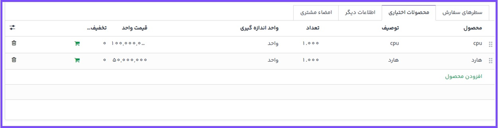 در برنامه فروش اوج ابری، تب محصولات اختیاری در فرم پیشفاکتور تعبیه شده است. شما میتوانید از این بخش محصولات یا خدمات تکمیلی را اضافه یا ویرایش کنید.