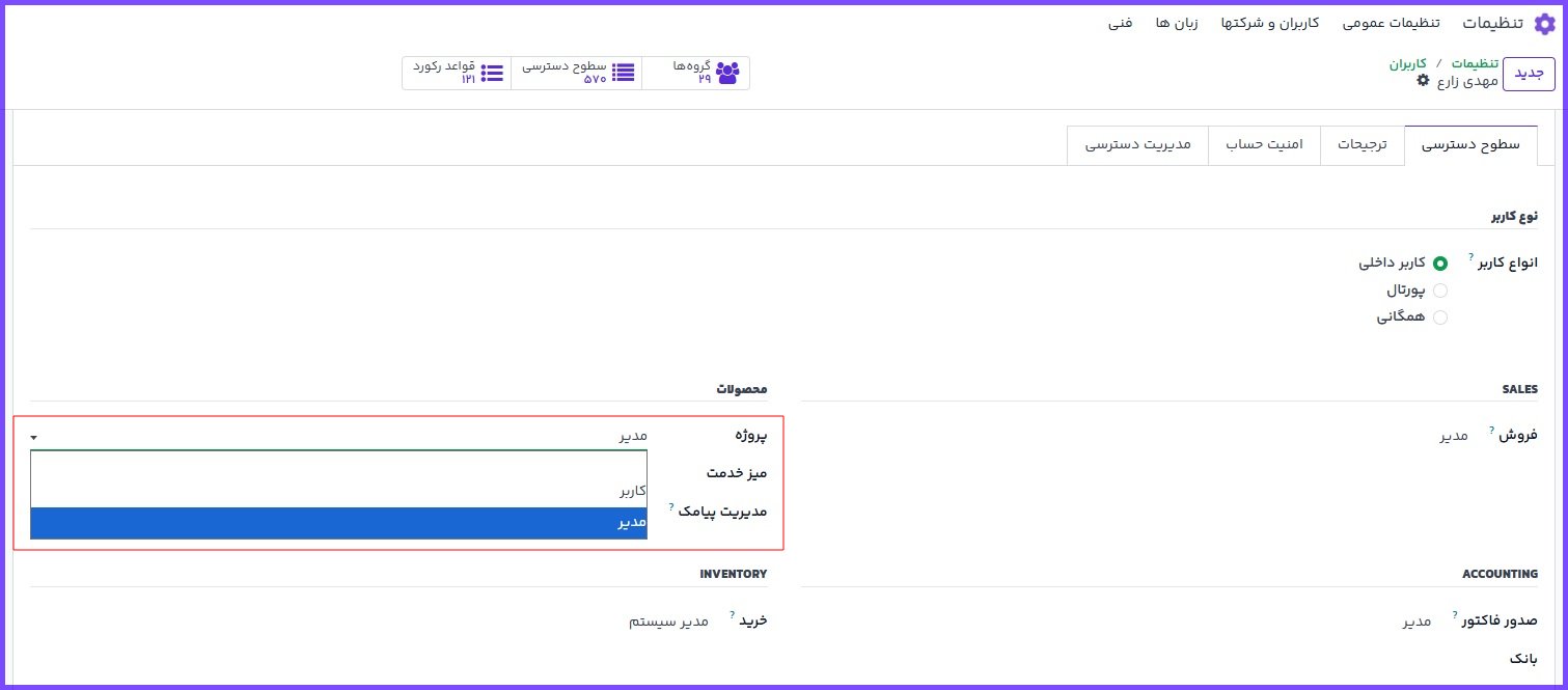 در فرم کاربر (تب سطوح دسترسی):