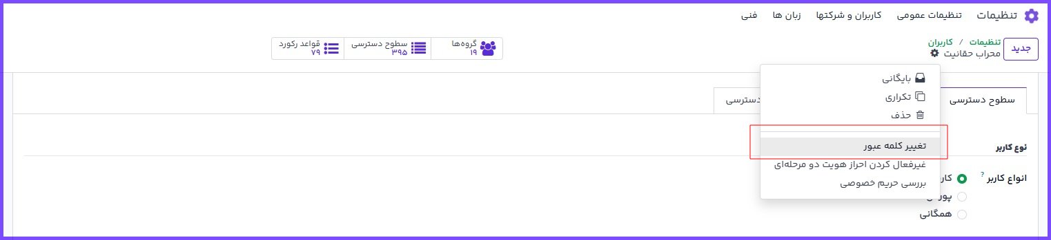 در همان فرم کاربر، از منوی ⚙️ گزینه تغییر کلمه عبور را انتخاب کنید.