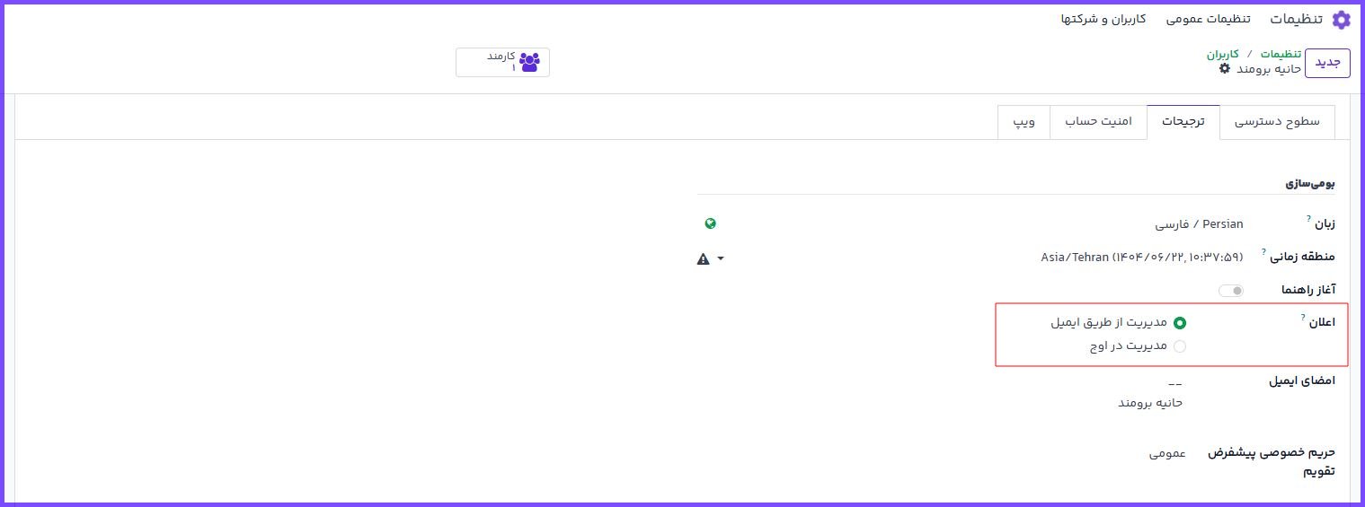 در فرم کاربر میتوان تنظیم کرد که اعلانها به صورت یادآور دسکتاپ یا ایمیل دریافت شوند.