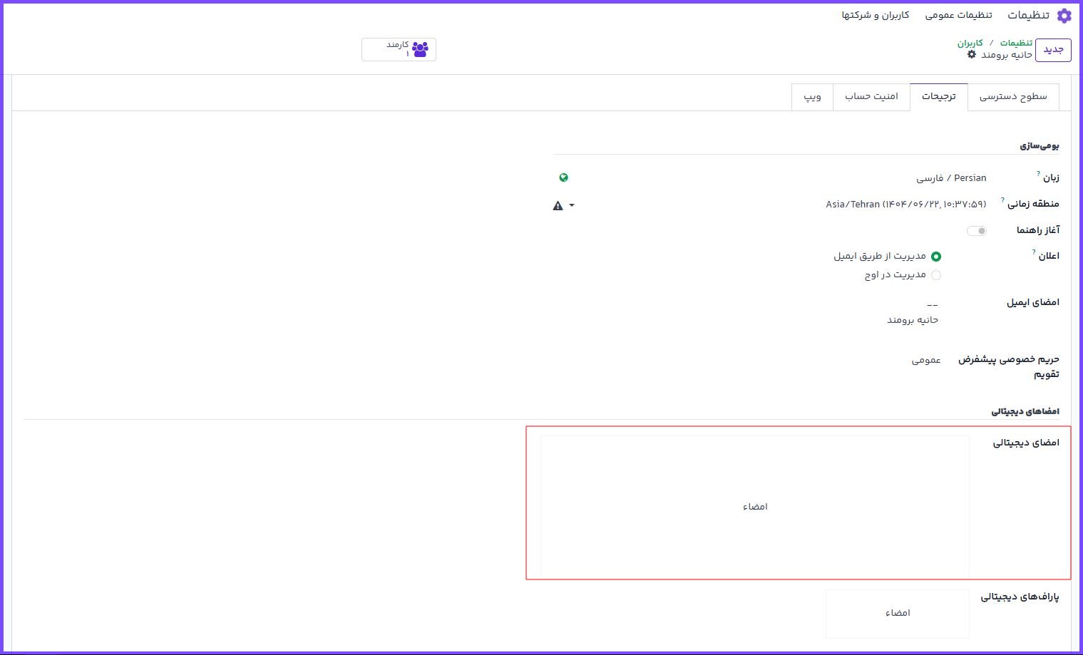 امضا در فرم کاربر (تب ترجیحات) قسمت امضاهای دیجیتال بارگذاری میشود.
