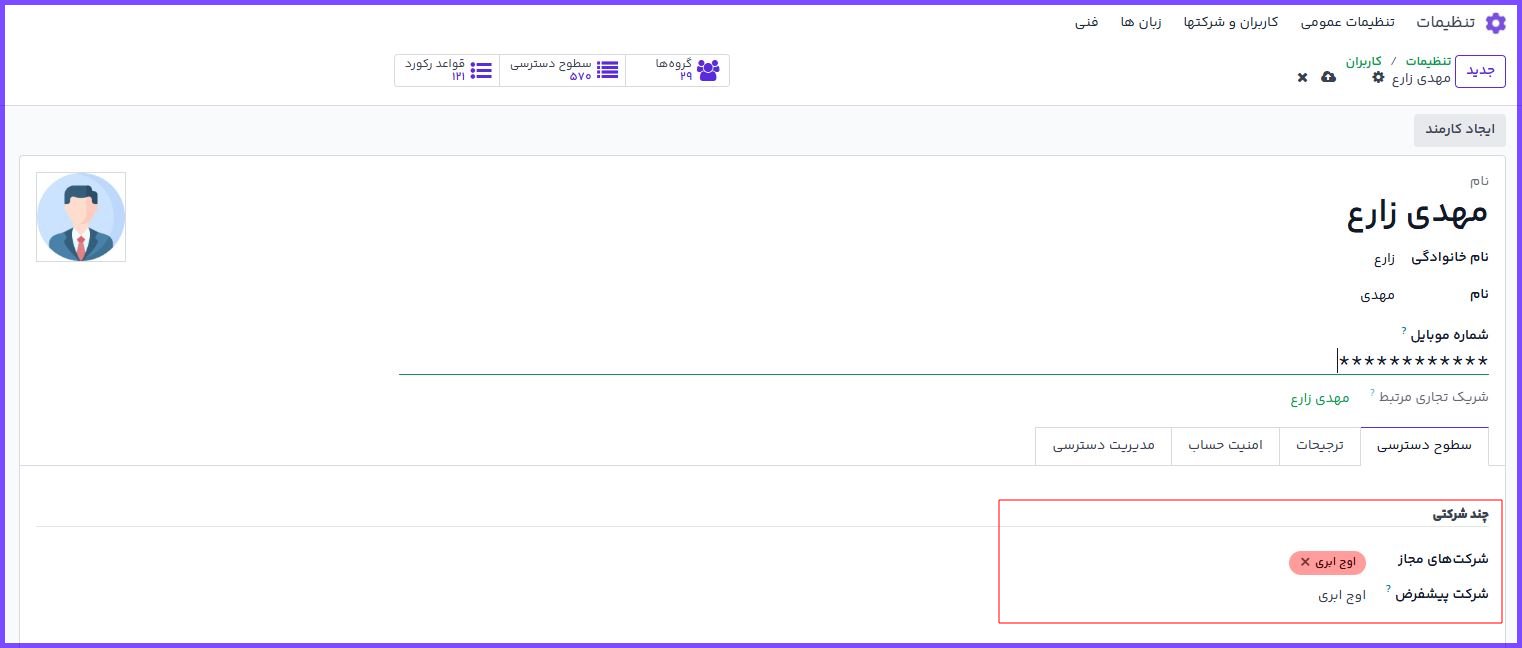 شرکت پیشفرض : شرکتی که پس از ورود کاربر به سیستم، به صورت خودکار فعال میشود. فقط یک شرکت میتواند پیشفرض باشد.