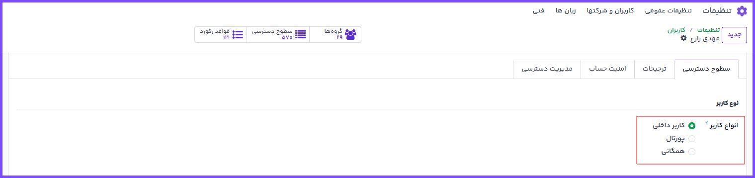 نکته: فقط کاربران داخلی قابل پیکربندی با گروههای دسترسی مختلف هستند. کاربران پورتال و عمومی دسترسیهای محدود و از پیش تعریفشده دارند.