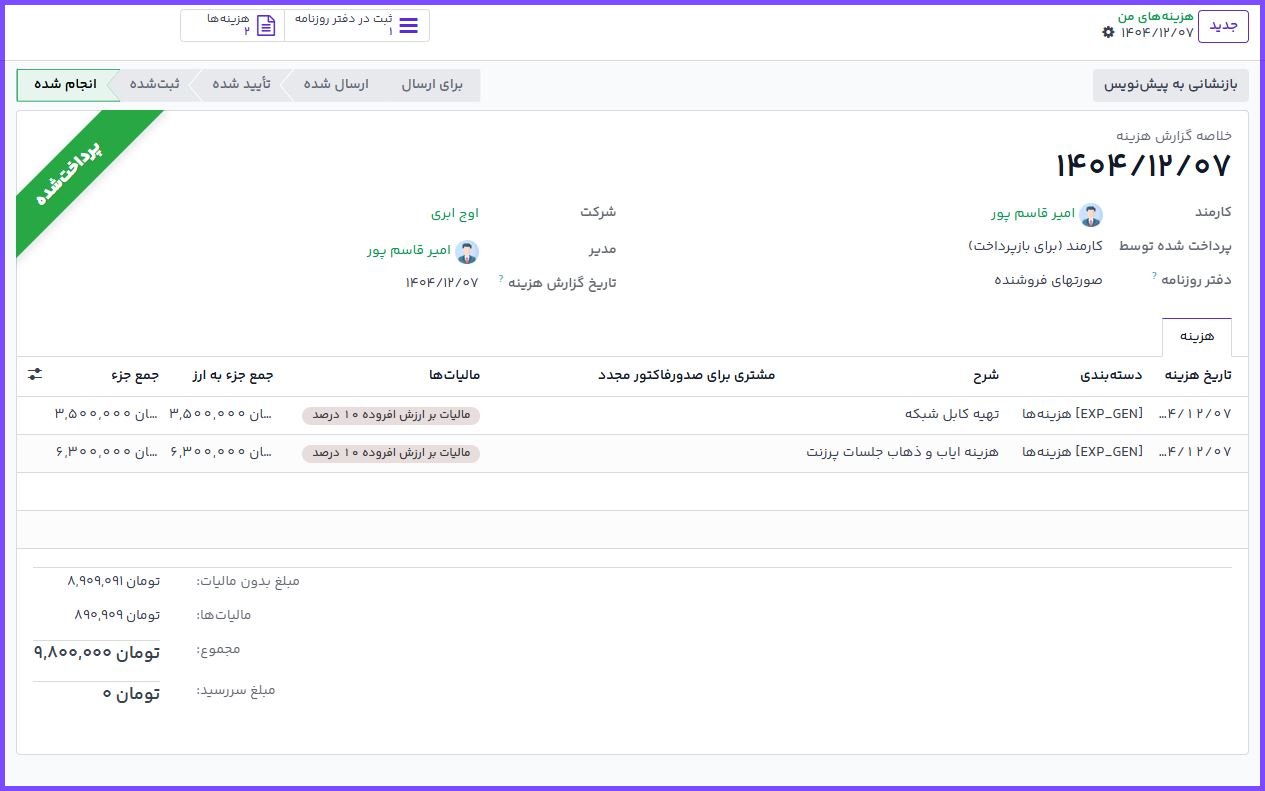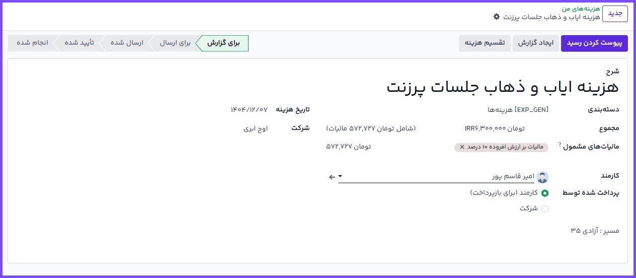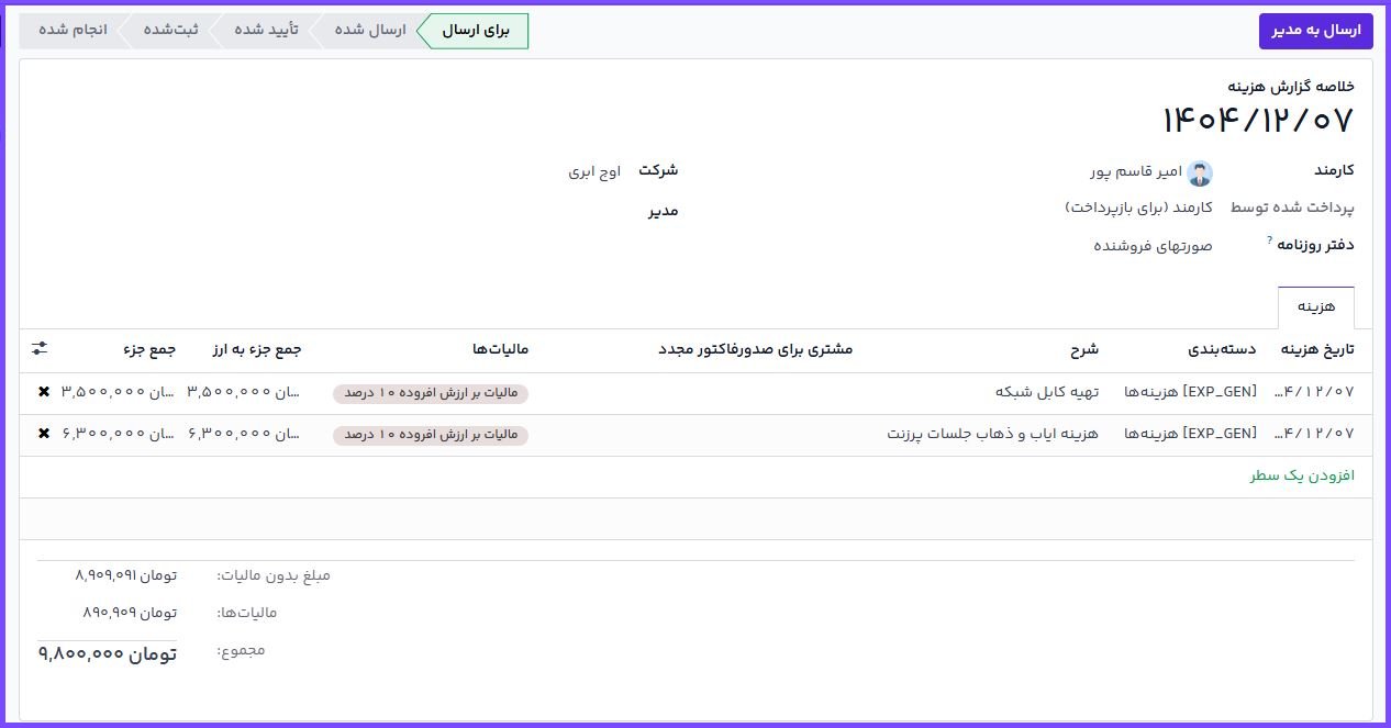 در ماژول هزینهها در اوج ابری، کارکنان میتوانند هزینههای انجامشده (مانند مأموریتهای کاری، خریدهای اداری یا پرداختهای مرتبط با پروژهها) را ثبت کرده و در قالب «گزارش هزینه» برای بررسی و تأیید ارسال کنند. این فرآیند بهصورت یکپارچه با بخش حسابداری و در صورت نیاز با فروش و پروژه نیز در ارتباط است.