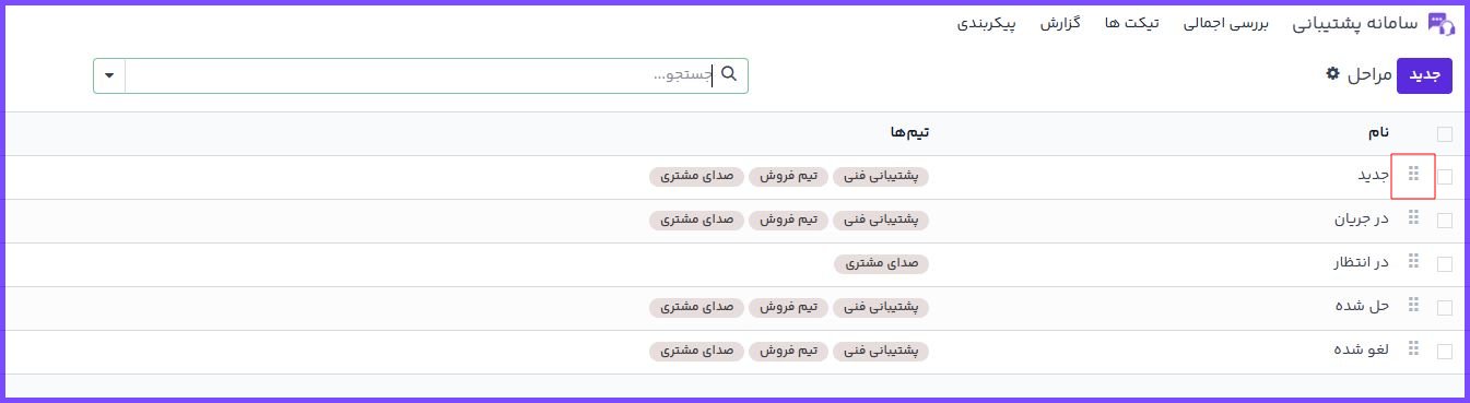 در این صفحه، فهرستی از تمام مراحل موجود نمایش داده میشود. ترتیب نمایش مراحل، همان ترتیبی است که در نمای کانبان تیم پشتیبانی نمایش داده میشود.