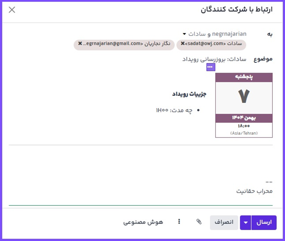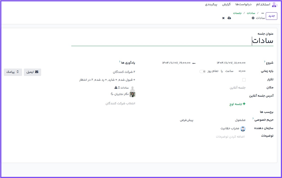 مدت زمان: این فیلد بر اساس تاریخ شروع و تاریخ پایان وارد شده محاسبه میشود. اگر زمان جلسه تغییر کند، این فیلد به صورت خودکار با مدت زمان درست اصلاح میشود.