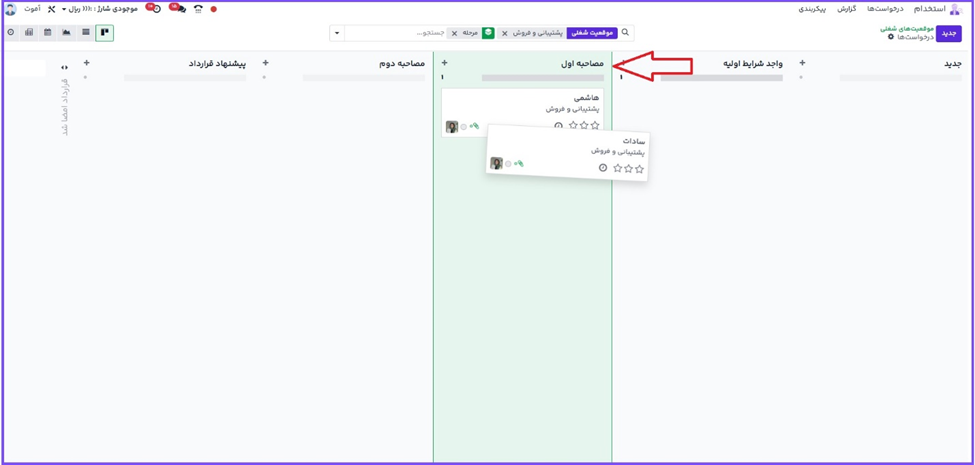 بعد از اینکه متقاضی از مرحله مصاحبه اول گذر کرد، میتوان او را به مرحله مصاحبه دوم انتقال داد. برای انتقال متقاضی به مرحله بعد، کارت او را به مرحله مصاحبه دوم بکشید و رها کنید، یا در کارت متقاضی بر روی دکمه مصاحبه دوم کلیک کنید.
