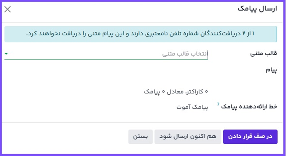 هرگاه در پیام نوشته شود 0 مورد نامعتبر است، پیام مورد نظر را در فیلد پیام وارد کنید. در قسمت پایین فیلد پیام، تعداد کاراکترها و تعداد پیامکهای مورد نیاز برای ارسال پیام نمایش داده میشود. برای اینکه متن بعداً ارسال شود، قرار دادن در صف را کلیک کنید تا پیام بعد از سایر پیامهای زمانبندی شده ارسال شود، یا برای ارسال فوری پیام ارسال فوری را کلیک کنید.