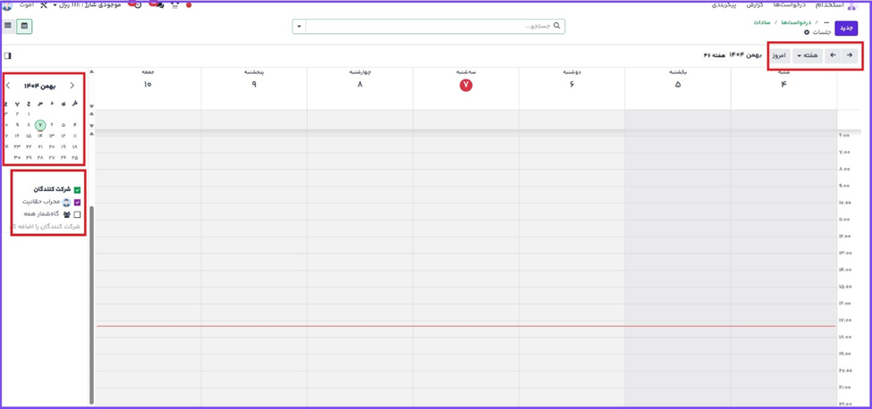 با این کار برنامه تقویم نمایش داده میشود، که جلسات و رویدادهای فعلی مربوط به کاربر را نشان میدهد. جلسهها و رویدادها برای کارمندانی است که در بخش شرکتکنندگان در نوار کناری تقویم نمایش داده میشوند. برای تغییر جلسات بارگیری شده فعلی و رویدادهایی که نمایش داده میشوند، تیک اشخاصی که رویداد تقویم آنها را نمیخواهید ببینید غیرفعال کنید. تنها شرکتکنندگانی که تیک دارند در تقویم نمایش داده خواهند شد.