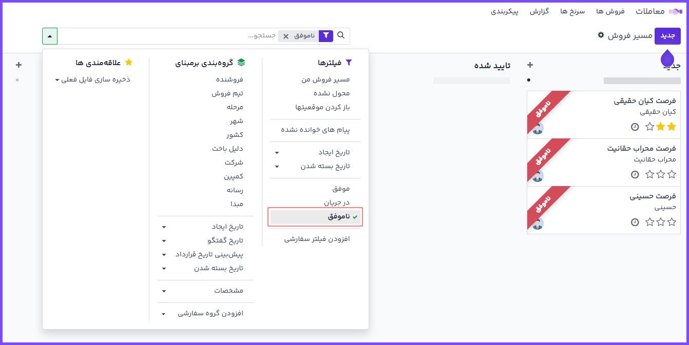 در نمای داشبورد فرصتها، فیلتر «ناموفق» را فعال کنید تا فهرست فرصتهای از دست رفته نمایش داده شود.