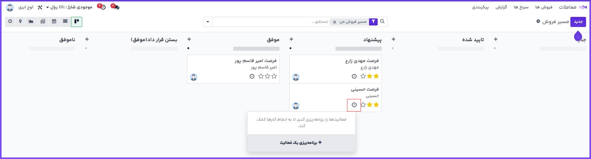در نمای کانبان فرصتها، با کلیک روی آیکون ساعت در کارت هر فرصت، میتوانید فعالیت جدیدی تعریف کنید.