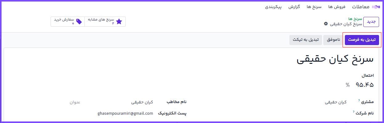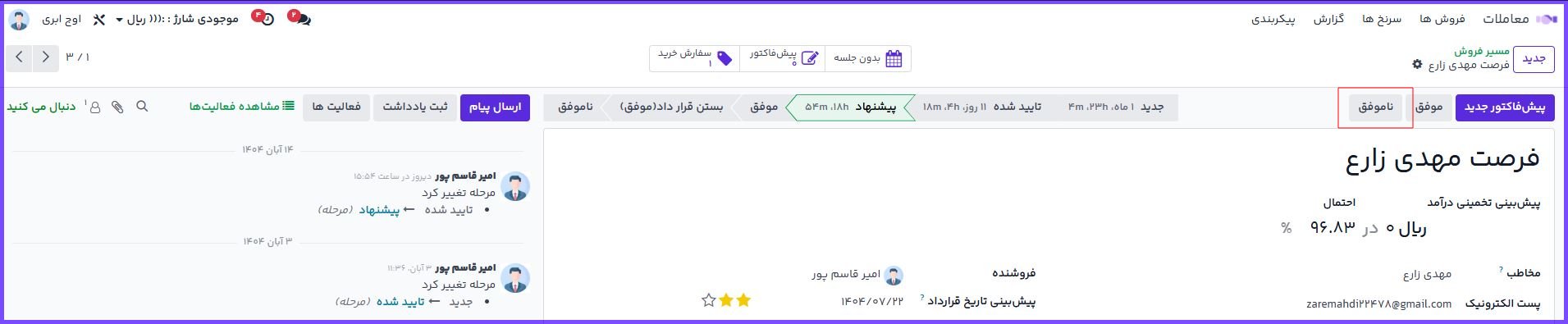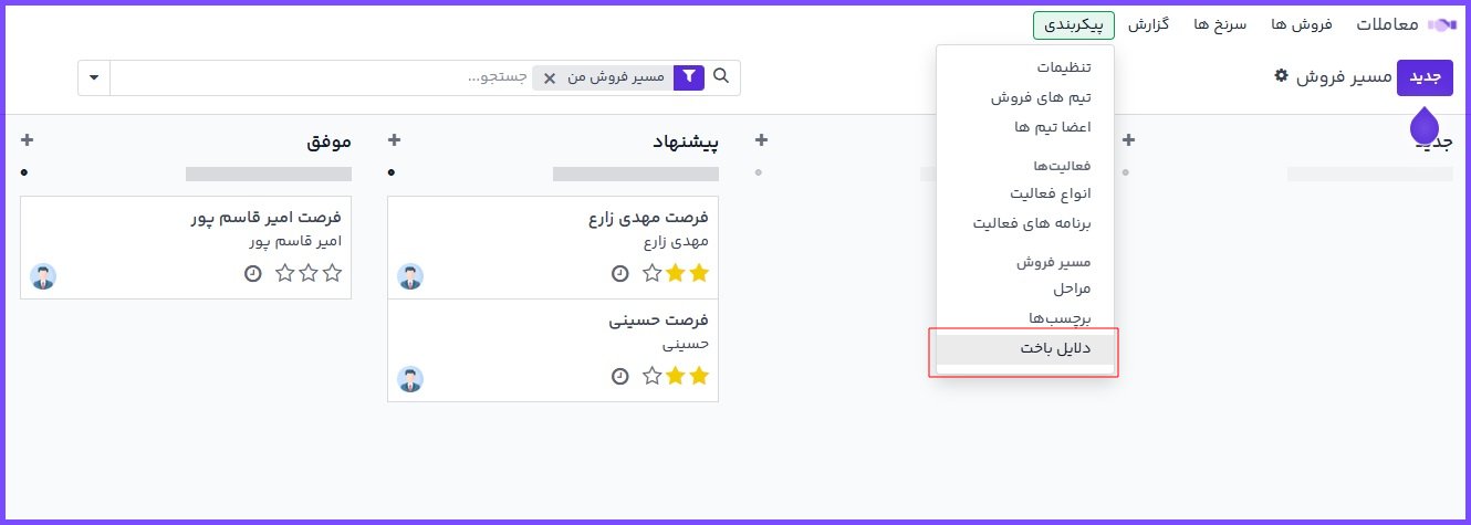 در داشبورد فرصتها، با انتخاب یک فرصت و کلیک بر روی دکمه ناموفق، میتوانید دلیل باخت را مشخص کنید یا دلیل جدیدی بسازید.