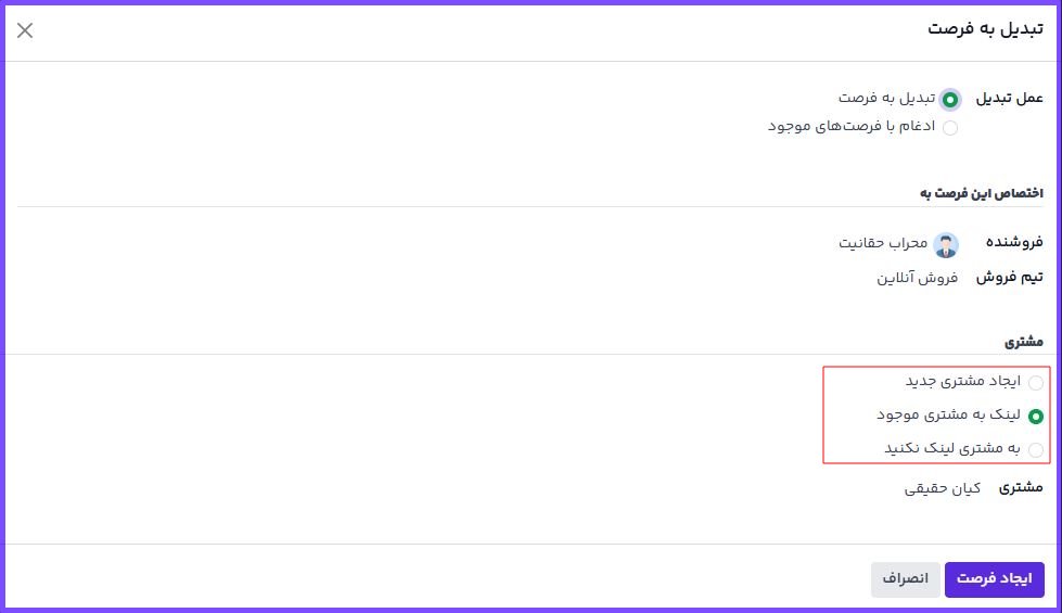 اگر مشتری از قبل وجود داشته باشد، سیستم بهصورت هوشمند پیشنهاد ادغام میدهد.