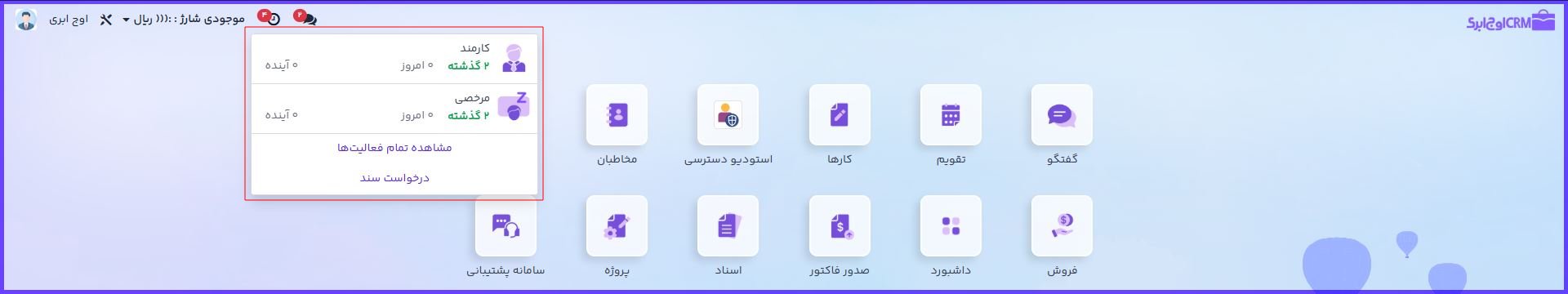 در هر بخش از اوج ابری، از طریق منوی بالای صفحه (آیکون فعالیتها)، میتوانید فهرست فعالیتهای در انتظار، تکمیلشده یا آتی را مشاهده کنید.