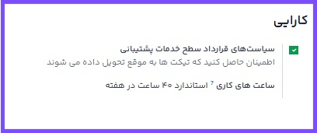 مقداری که در فیلد ساعتهای کاری نمایش داده شده است برای تعیین زمان سررسید سیاستهای SLA به کار میرود. در حالت پیشفرض، این مقدار از طریق مقدار مشخص شده در فیلد ساعتهای کاری شرکت در منوی تنظیمات ◄ کارمندان ◄ سازمان تعیین میشود.