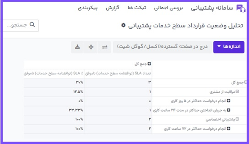 گزارش تحلیل وضعیت SLA سرعت تحقق SLA را رهگیری میکند، و نرخ موفقیت تک تک سیاستها را نشان میدهد. با ورود به منوی سامانه پشتیبانی ◄ گزارش ◄ تحلیل وضعیت SLA به گزارش و نمای پیوت مربوطه وارد شوید.