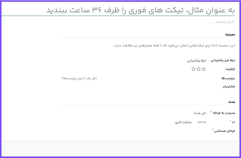 هدف در واقع مرحلهای است که تیکت برای تحقق سیاست SLA باید به آن برسد، و زمان تخصیص یافته برای دسترسی به آن مرحله را مشخص میکند. هر مرحلهای که به تیم تخصیص یافته باشد را میتوان در فیلد مرحله هدف مشخص کرد. زمان صرف شده در مراحلی که در بخش به استثنای مراحل انتخاب شدهاند در محاسبه سررسید SLA به کار برده نمیشود.