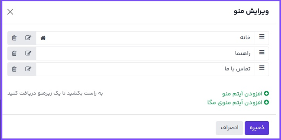 با استفاده از آیکون ویرایش آیتم منو یکی از آیتمهای منو را تغییر نام یا آدرس URL آن را تغییر دهید؛