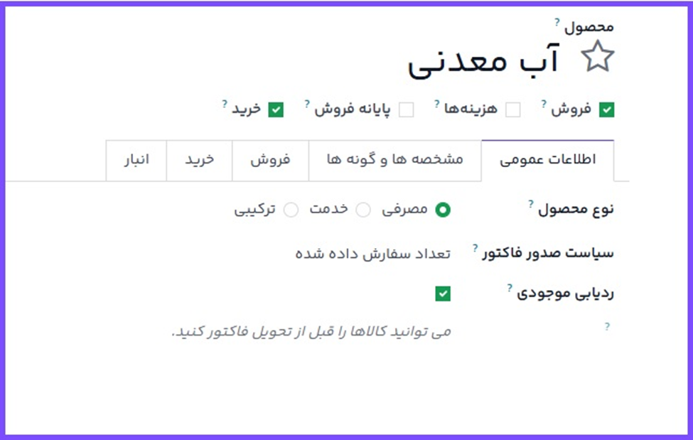 در فرم محصول، تیک گزینه قابل خرید زیر فیلد نام محصول را فعال کنید تا سفارش مجدد ممکن شود؛ سپس در تب اطلاعات عمومی، گزینه ردیابی موجودی را فعال کنید.