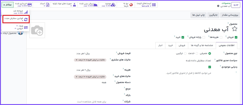 قبل از افزودن قانون سفارش مجدد به محصول، ابتدا باید خود محصول پیکربندی شود.