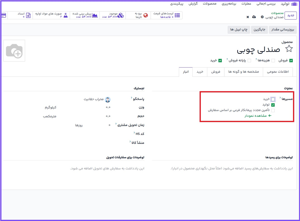 در صفحه محصول وارد تب انبار شوید. در بخش مسیرها گزینه تولید را فعال کنید. با این کاراوج ابری میداند که محصول را میتوان تولید کرد.