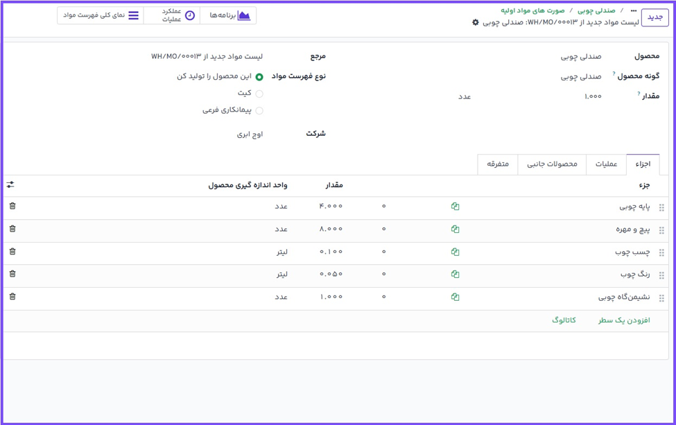 در تب اجزا با کلیک بر دکمه افزودن سطر یک محصول مصرفی برای لیست مواد اضافه کنید. از منوی کشویی باز شده یک محصول مصرفی انتخاب کنید و تعداد مورد نظر را در فیلد تعداد وارد کنید. همین کار را برای تمام محصولات مصرفی اضافه کنید.