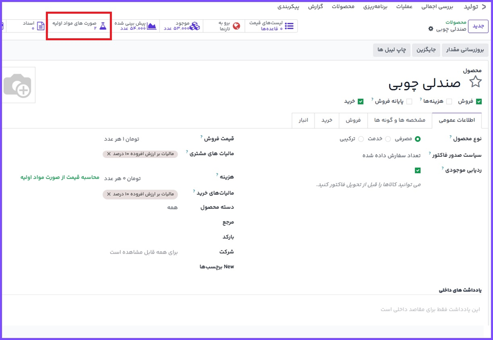 در صورت های مواد اولیه، فیلد محصول به صورت خودکار برای محصول مورد نظر پر شده است. در فیلد تعداد مشخص کنید که این لیست مواد چند واحد از محصول را تولید میکند.
