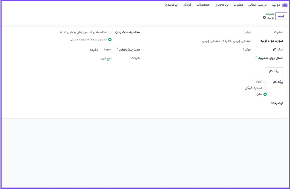 تب عملیات تنها زمانی نمایش داده میشود که تنظیمات سفارشهای کار فعال شده باشد. برای این کار وارد مسیر تولید ◄ پیکربندی ◄ تنظیمات شوید و گزینه سفارشهای کار را فعال کنید.