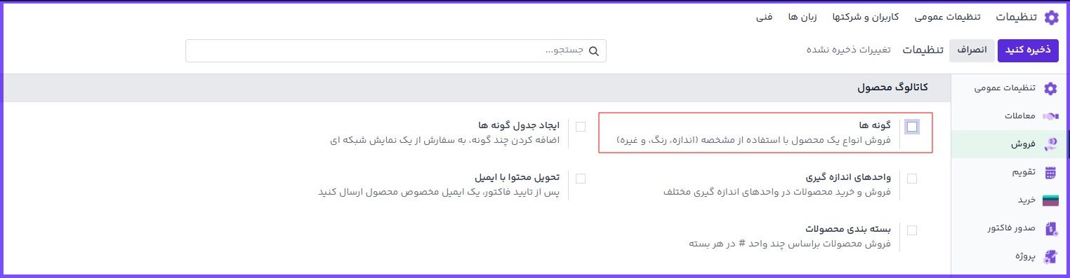 در بخش کاتالوگ محصول، گزینه گونههای محصول را فعال کنید.
