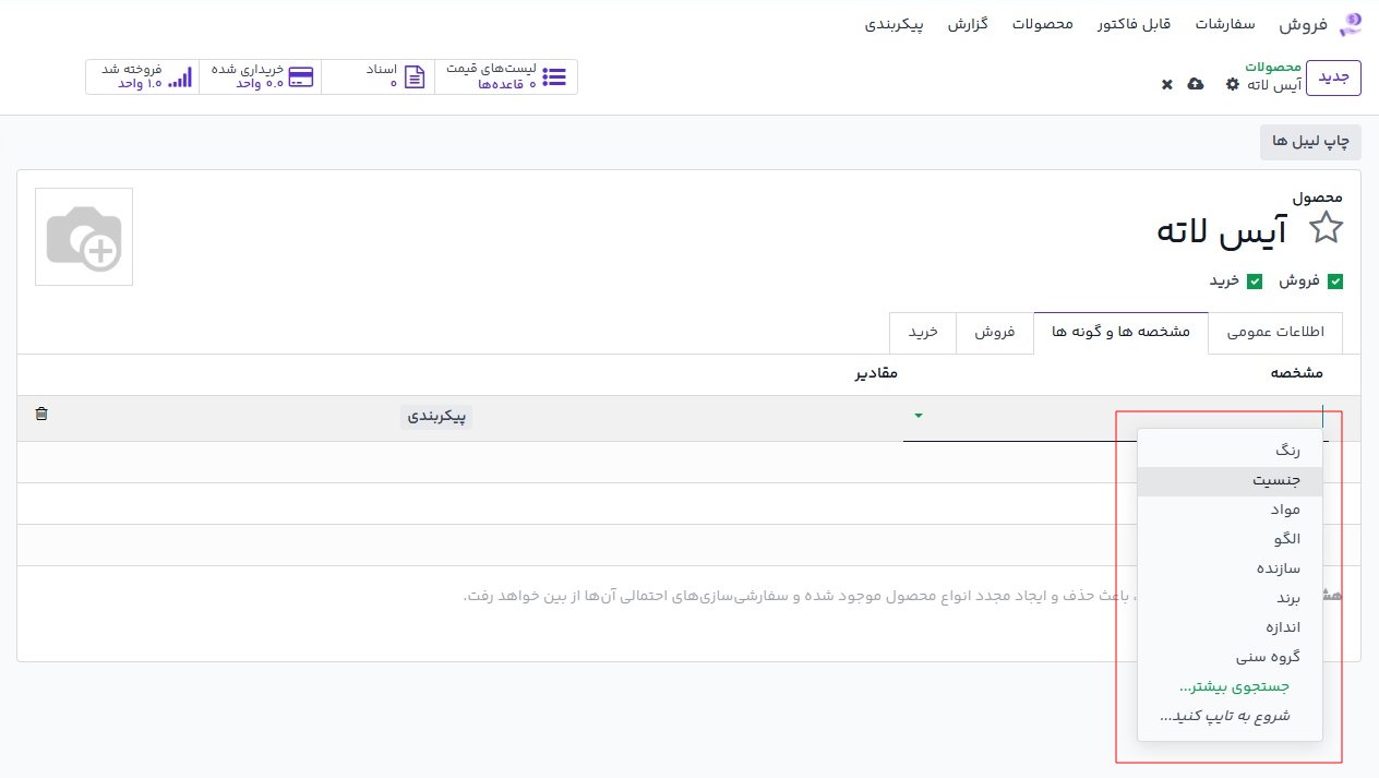 📌 نکته: مشخصهها و مقادیر را میتوانید مستقیماً در فرم محصول هم ایجاد کنید (با گزینه "ایجاد" یا "ایجاد و ویرایش").