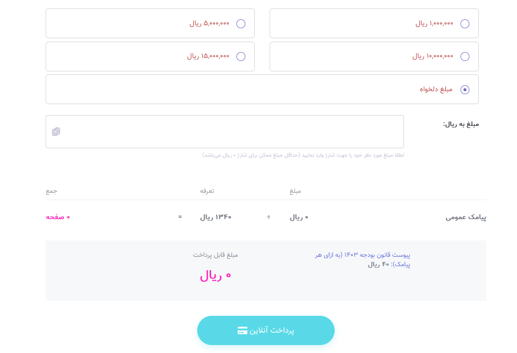 نکته : حداقل مبلغ واریزی برای افزایش اعتبار سامانه 500 هزار ریال معادل 50 هزار تومان میباشد.