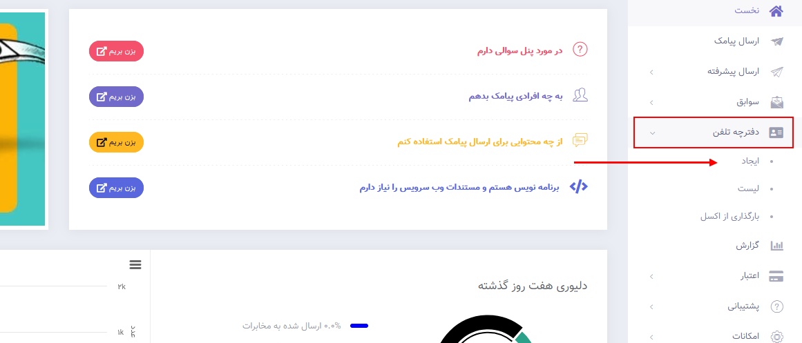 پس از وارد شده به پنل کاربری خود ، گزینۀ دفترچه تلفن و سپس ایجاد را انتخاب کنید.