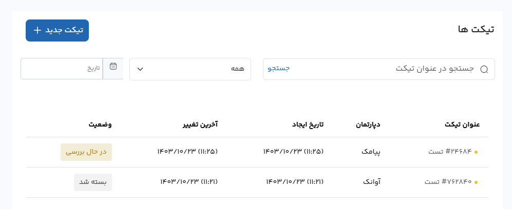 نکته : پس از بررسی تیکت توسط پشتیبانی، پاسخ مربوطه در ادامه همان تیکت ثبت خواهد شد. برای دریافت پاسخ، لطفاً به پنل کاربری خود مراجعه کرده و در بخش «پشتیبانی»، سپس «لیست تیکتها»، پاسخ تیکت خود را بررسی نمایید.