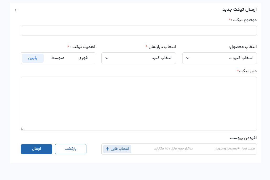 اهمیت: بسته به درجه فوریت یا اهمیت درخواست، سطح اولویت تیکت را مشخص نمایید.