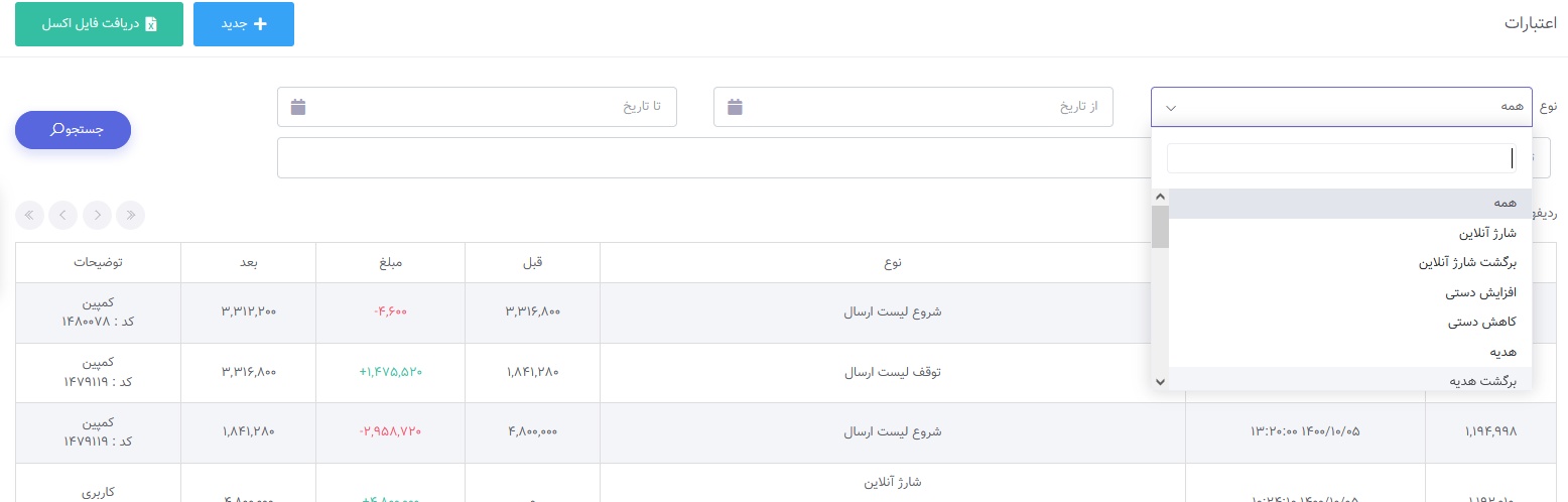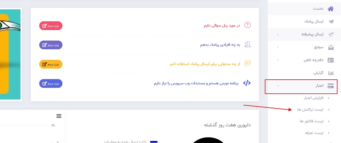 پس از وارد شده به پنل کاربری خود ، گزینۀ اعتبار - لیست تراکنش ها را انتخاب کنید.